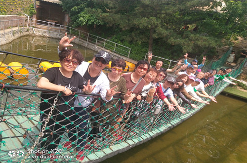 在富饶农场水上乐园,大家迫不及待地玩起了空中飞人、铁链秋千、独木桥、摇摆网红桥、绳索桥……。大家最喜欢玩的要数摇摆网红桥了,它即惊险又刺激,站在桥上摇摆起来随时都有被甩下水的可能, 湿你没商量,但大家丝毫没有半点惊惶,看他们玩得多么带劲,多么嗨!下午我们游览了《小儿西游记》拍摄取景地的神秘水帘洞;有稻田地、果树园的绿色植物长廊;栩栩如生的牲口雕塑;曲径通幽的栈道和小路;民俗小院等农场自然景观。在富饶农场美丽的后花园,一穗穗金灿灿的玉米,一片丰收的景象,我们平日里生活在喧哗城市之中哪见得如此美丽的风景,爱好拍照的聋人们每到一处都拍下了很多美丽的回忆。