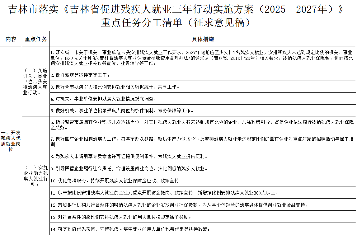 关于对《吉林市落实<吉林省促进残疾人就业三年行动实施方案(2025—2027年)> 重点任务分工清单(征求意见稿)》 公开征求意见的公告